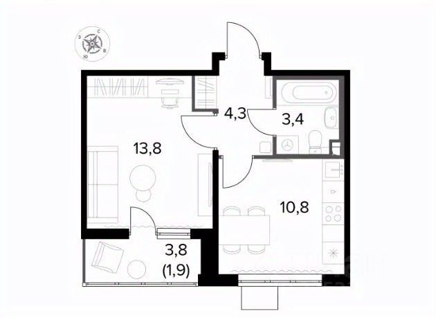 Площадь квартиры 32,3 кв.м, просторная кухня 10,8 кв.м, комната 13,8, лоджия 3,8 кв.м.