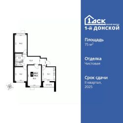 Продаётся 3-к квартира номер 85 общей площадью 75.3 кв.м. на 2-м этаже 21 этажного здания. Чистовая отделка. Цена с учётом скидки.