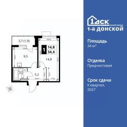 Продаётся 1-к квартира номер 218 общей площадью 34.4 кв.м. на 21-м этаже 24 этажного здания. Отделка Whitebox.