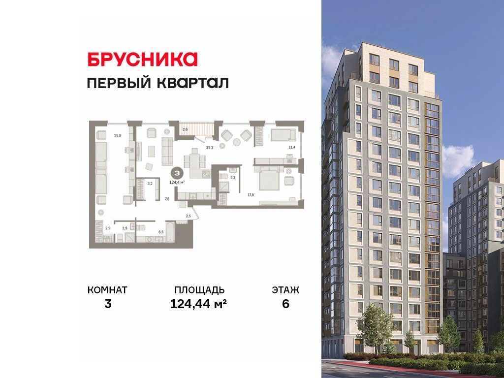 Квартира с кухней-гостиной и тремя спальнями в "Первом квартале". Особенности планировки: мастер-спальня, предчистовая отделка.