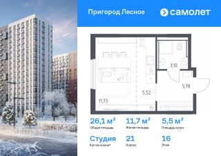 Строим кварталы для жизни с заботой о будущем. Предлагается квартира студия комфорт-класса 26,13 кв.м в корпусе 21 на 16 этаже, в ЖК "Пригород Лесное"