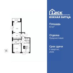 Продаётся 3-к квартира номер 72 общей площадью 63.6 кв.м. на 12-м этаже 22 этажного здания. Отделка Whitebox.