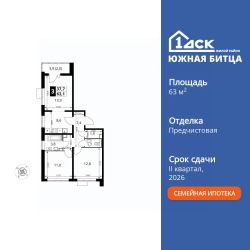 Продаётся 3-к квартира номер 720 общей площадью 63.6 кв.м. на 13-м этаже 22 этажного здания. Отделка Whitebox.
