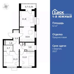 Продаётся 3-к квартира номер 80 общей площадью 62.3 кв.м. на 21-м этаже 24 этажного здания. Отделка Whitebox.