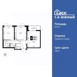 Продаётся 2-к квартира номер 150 общей площадью 59.1 кв.м. на 15-м этаже 25 этажного здания. Отделка Whitebox. Цена с учётом скидки.