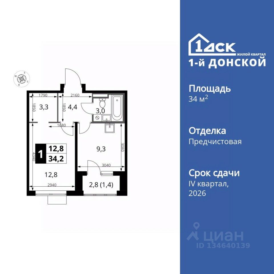 Продаётся 1-к квартира номер 937 общей площадью 34.2 кв.м. на 24-м этаже 24 этажного здания. Отделка Whitebox.