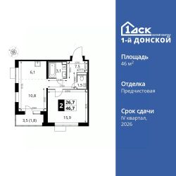 Продаётся 2-к квартира номер 842 общей площадью 46.7 кв.м. на 13-м этаже 24 этажного здания. Отделка Whitebox.