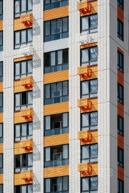 Секции-маяки формируют у зданий визуальную L-форму, что придает застройке структуру и ритмику объемов. На ощущение динамики работает и разная этажность зданий.