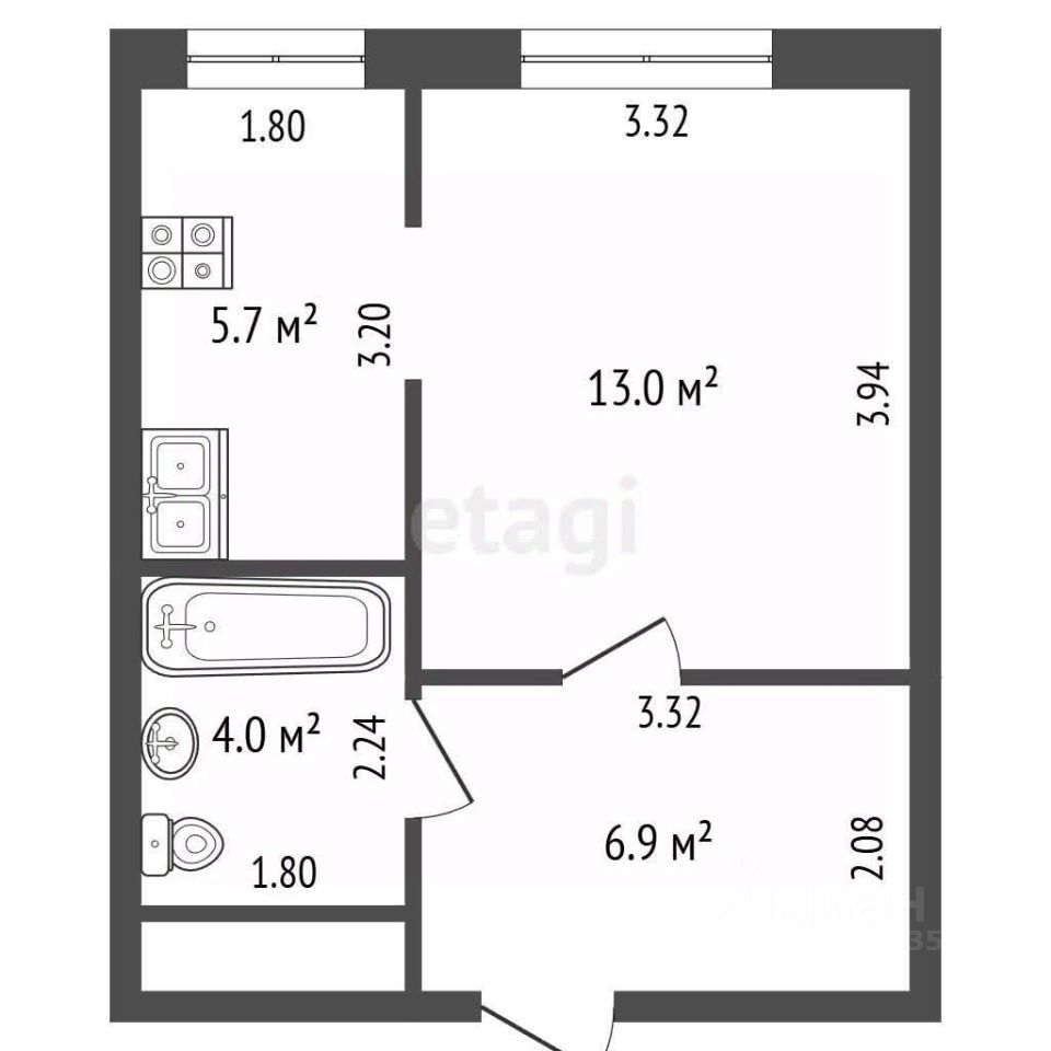 Жилая зона составляет 13.1 кв. м, кухня — 5.8 кв. м. Ключевым преимуществом являются потолки высотой 3 метра, визуально расширяющие пространство и наполняющие помещение светом.