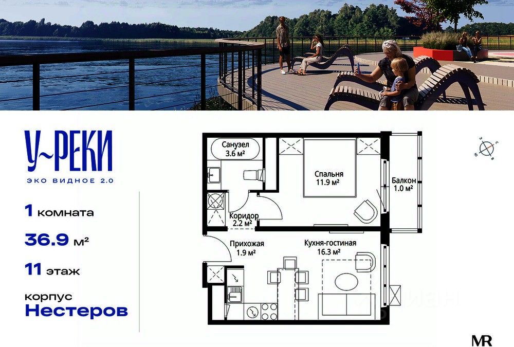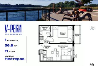 Продаётся 1-комнатная квартира общей площадью 36.90 м² с предчистовой отделкой в ЖК "У реки. Эко Видное 2.0" на 11-м этаже корпуса Нестеров.