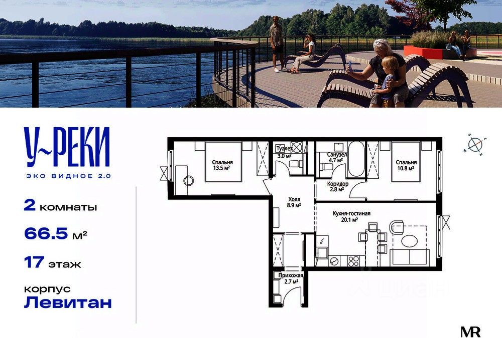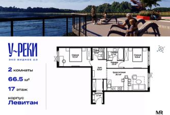 Продаётся 2-комнатная квартира общей площадью 66.50 м² без отделки в ЖК "У реки. Эко Видное 2.0" на 17-м этаже 17 этажного корпуса Левитан.