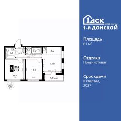 Продаётся 3-к квартира номер 261 общей площадью 61.9 кв.м. на 2-м этаже 24 этажного здания. Отделка Whitebox.