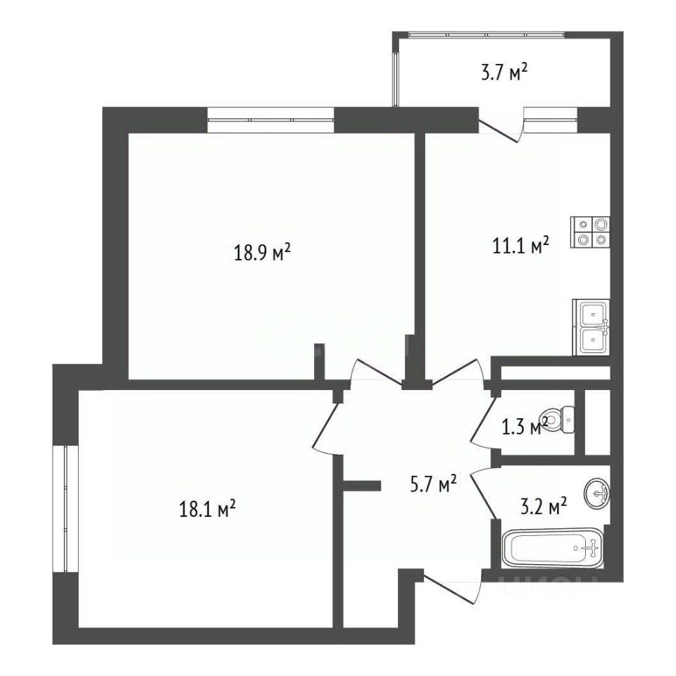 В квартире 2 изолированные комнаты, раздельный санузел, просторная кухня-гостиная.