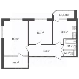 2 комнаты, в которых можно сделать выгодную планировку с большими комнатами. Сделать 25 кв.м. кухню. Большой санузел.