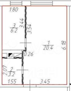 Квартира расположена на первом этаже четырехэтажного дома. Жилая площадь составляет 20.3 кв. м, кухня — 6.2 кв. м.