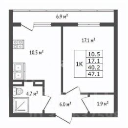 Однокомнатная с большой кухней 10.5 кв. м, общей площадью 47.1 кв. м. Высокий этаж всегда обеспечит много света