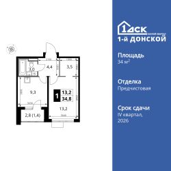 Продаётся 1-к квартира номер 866 общей площадью 34.8 кв.м. на 16-м этаже 24 этажного здания. Отделка Whitebox.