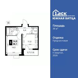 Продаётся 1-к квартира номер 727 общей площадью 38.9 кв.м. на 14-м этаже 22 этажного здания. Отделка Whitebox.