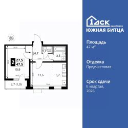 Продаётся 2-к квартира номер 558 общей площадью 47.7 кв.м. на 9-м этаже 22 этажного здания. Отделка Whitebox.