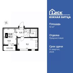 Продаётся 1-к квартира номер 442 общей площадью 42.4 кв.м. на 20-м этаже 24 этажного здания. Отделка Whitebox. Цена с учётом скидки.