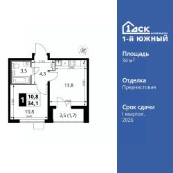Продаётся 1-к квартира номер 278 общей площадью 34.1 кв.м. на 16-м этаже 25 этажного здания. Отделка Whitebox. Цена с учётом скидки.