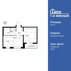 Продаётся 2-к квартира номер 336 общей площадью 44 кв.м. на 10-м этаже 24 этажного здания. Отделка Whitebox.