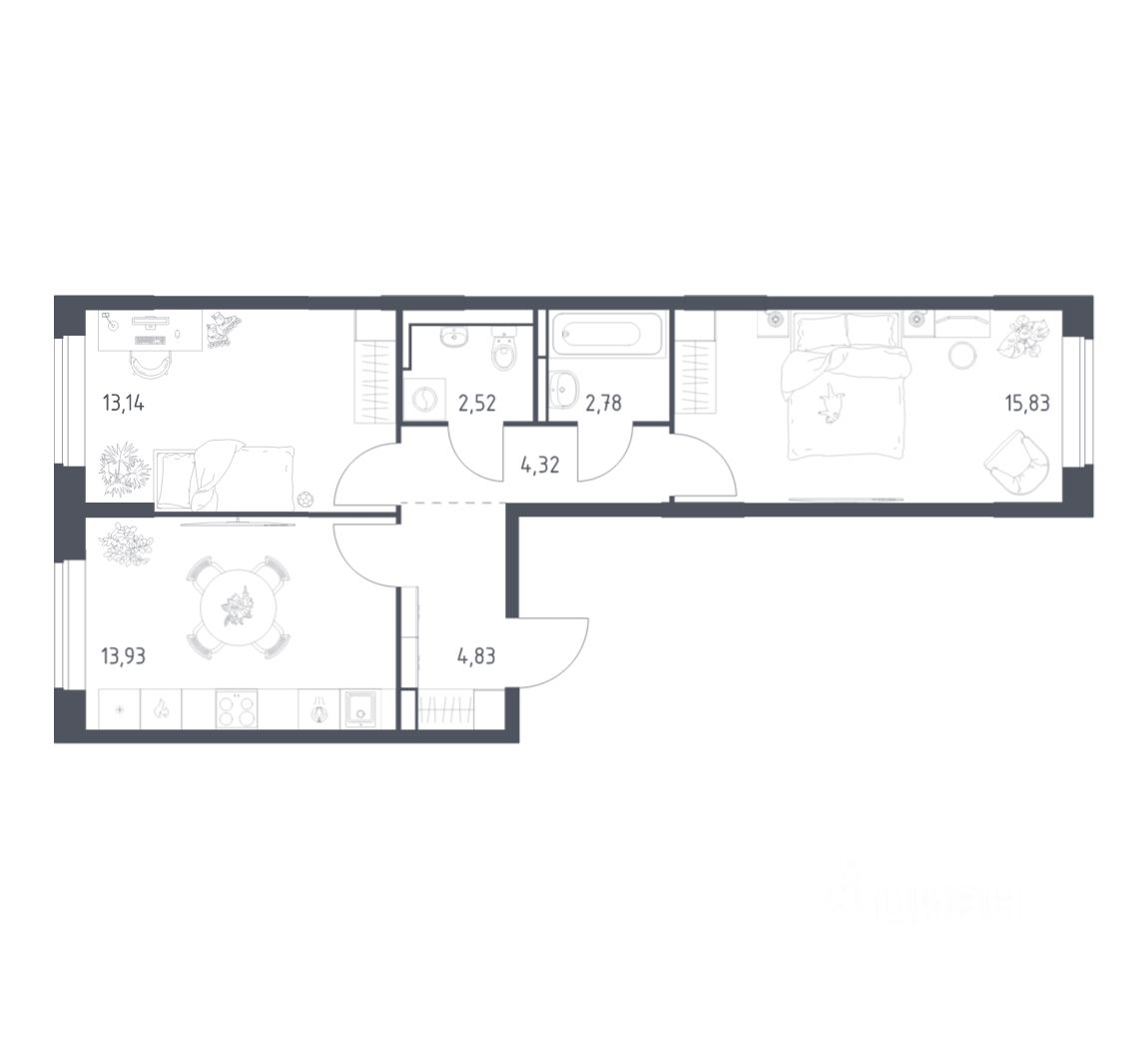 Строим кварталы для жизни с заботой о будущем. Предлагается 2-комнатная квартира комфорт-класса площадью 57,35 кв.м в корпусе 7.3 на 7-м этаже, в жилом комплексе "Богдановский Лес".