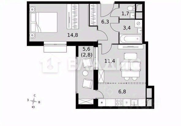 Просторная планировка: общая площадь квартиры — 50 кв. м, жилая — 26,2 кв. м, площадь кухни — 6,8 кв. м. Высота потолков 2,8 м создаёт ощущение простора и свободы.