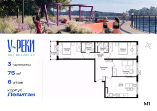 Продаётся 3-комнатная квартира общей площадью 75 м² с чистовой отделкой в ЖК "У реки. Эко Видное 2.0" на 6-м этаже 17 этажного корпуса Левитан.