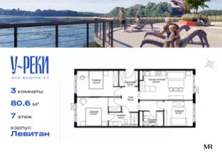 Продаётся 3-комнатная квартира общей площадью 80.60 м² с чистовой отделкой в ЖК "У реки. Эко Видное 2.0" на 7-м этаже 17 этажного корпуса Левитан.