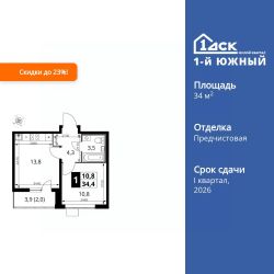 Продаётся 1-к квартира номер 460 общей площадью 34.3 кв.м. на 19-м этаже 24 этажного здания. Отделка Whitebox. Цена с учётом скидки.