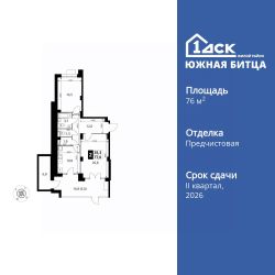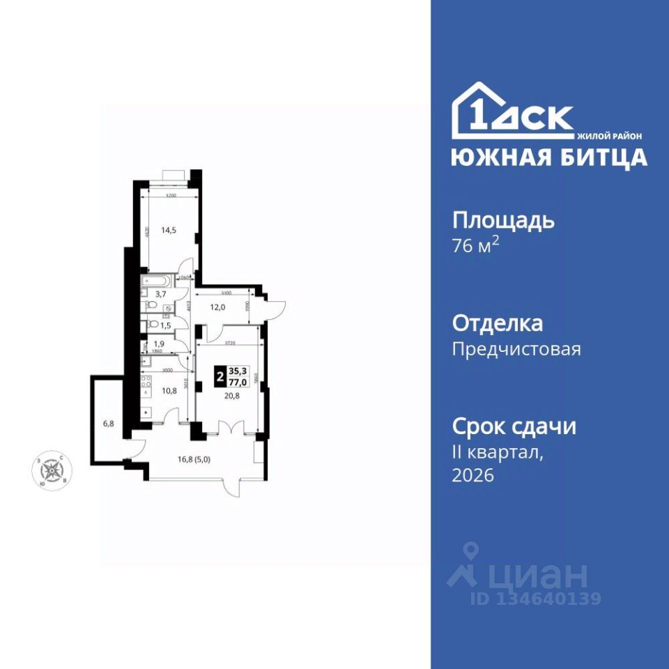 Продаётся 2-к квартира номер 257 общей площадью 76.5 кв.м. на 1-м этаже 22 этажного здания. Отделка Whitebox.