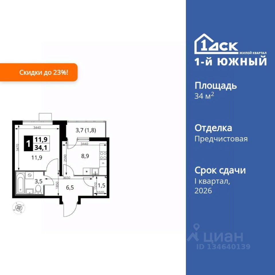 Продаётся 1-к квартира номер 616 общей площадью 34 кв.м. на 16-м этаже 24 этажного здания. Отделка Whitebox. Цена с учётом скидки.