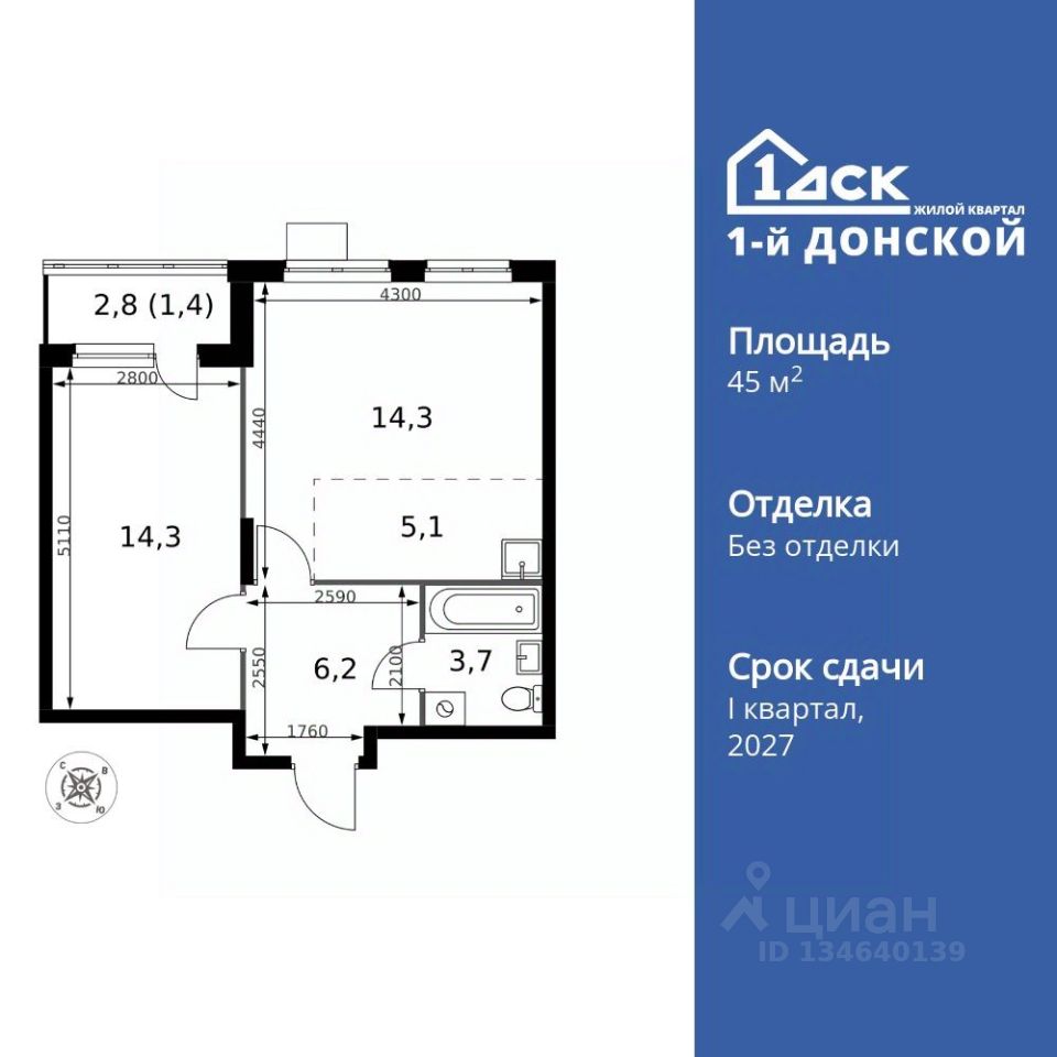 Продаётся 2-к квартира номер 533 общей площадью 45 кв.м. на 2-м этаже 24 этажного здания. Без отделки.