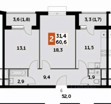 - Общая площадь: 60,6 кв.м., что идеально подойдёт как для одного жильца, так и небольшой семьи.