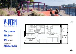 Продаётся студия общей площадью 18.90 м² с предчистовой отделкой в ЖК "У реки. Эко Видное 2.0" на 14-м этаже 17 этажного корпуса Левитан.