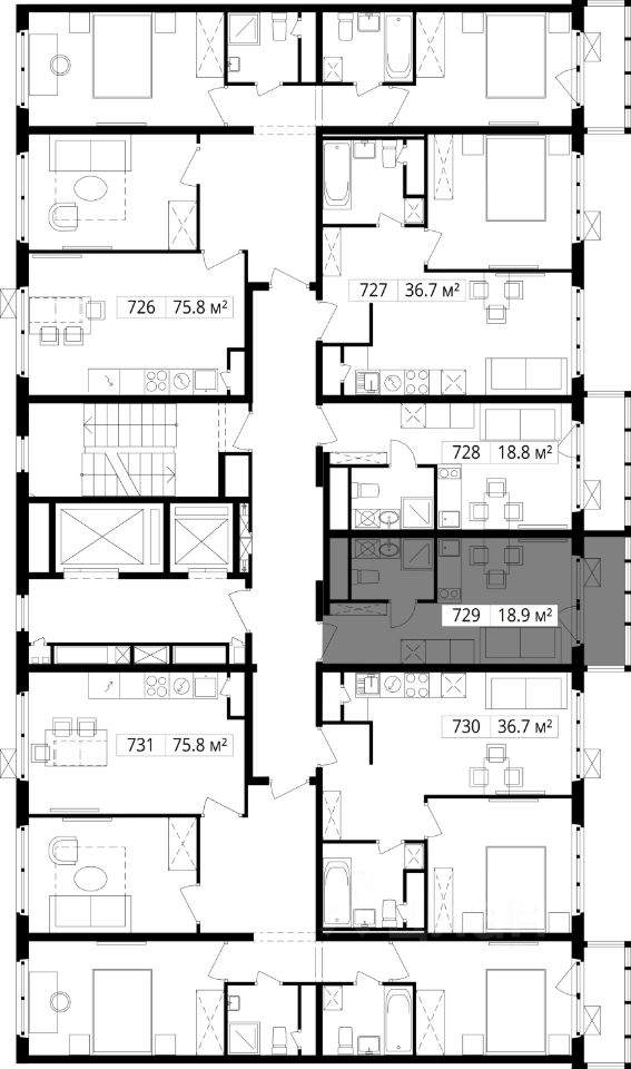 Семнадцатиэтажный корпус "Левитан" состоит из 13 секций, образующих в плане закрытый периметр двора.