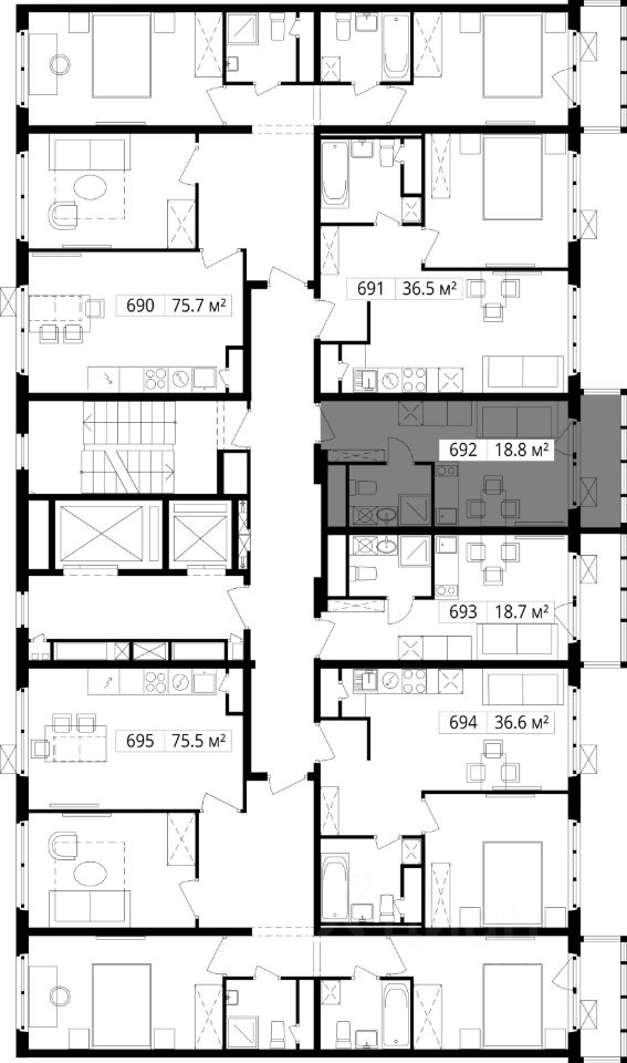 Семнадцатиэтажный корпус "Левитан" состоит из 13 секций, образующих в плане закрытый периметр двора.