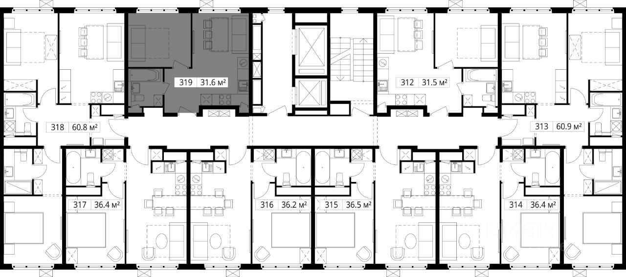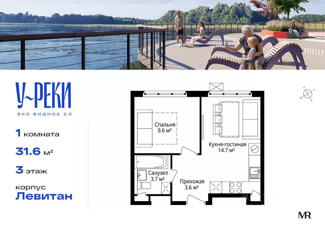 Продаётся 1-комнатная квартира общей площадью 31.60 м² с предчистовой отделкой в ЖК "У реки. Эко Видное 2.0" на 3-м этаже 17 этажного корпуса Левитан.