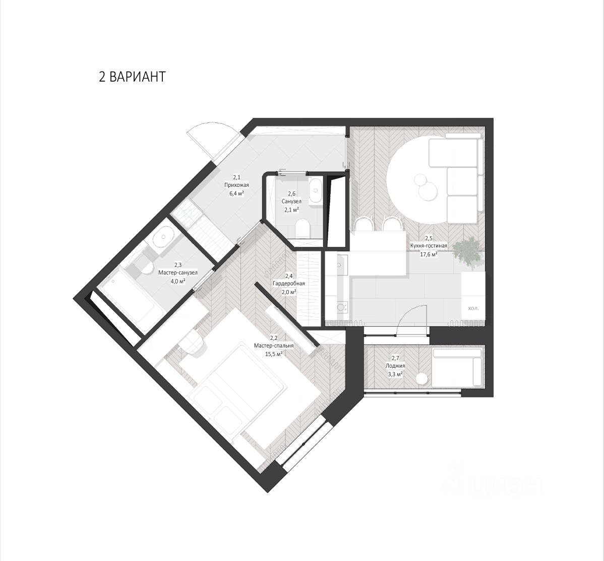 Квартира - 75 квадратных метров. 1 лоджия, 2 санузла, просторная кухня-гостиная и 2 спальни. Окна во двор и на лесопарк.