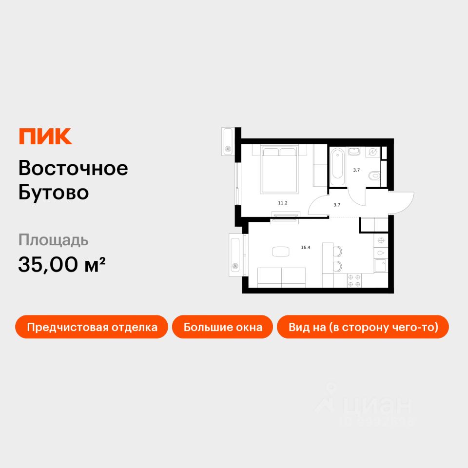 Продаётся 1-комн. квартира площадью 35 кв.м на 15 этаже 17 этажного дома (Корпус 48, Секция 2) проекта ПИК Восточное Бутово. Светлый просторный подъезд на уровне земли, функциональная планировка, большие окна, предчистовая отделка.