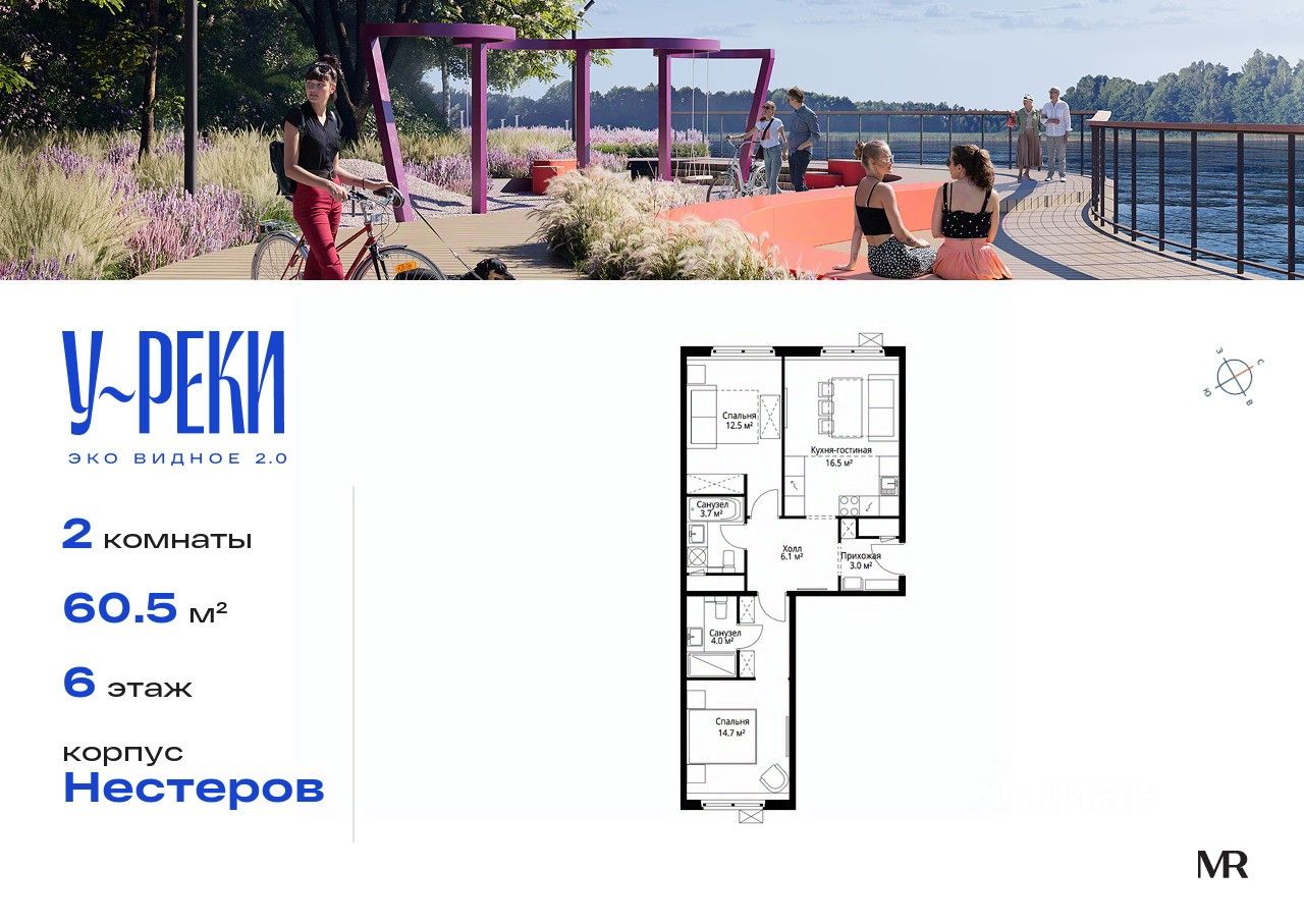 Продаётся 2-комнатная квартира общей площадью 60.50 м² с предчистовой отделкой в ЖК "У реки. Эко Видное 2.0" на 6-м этаже корпуса Нестеров.