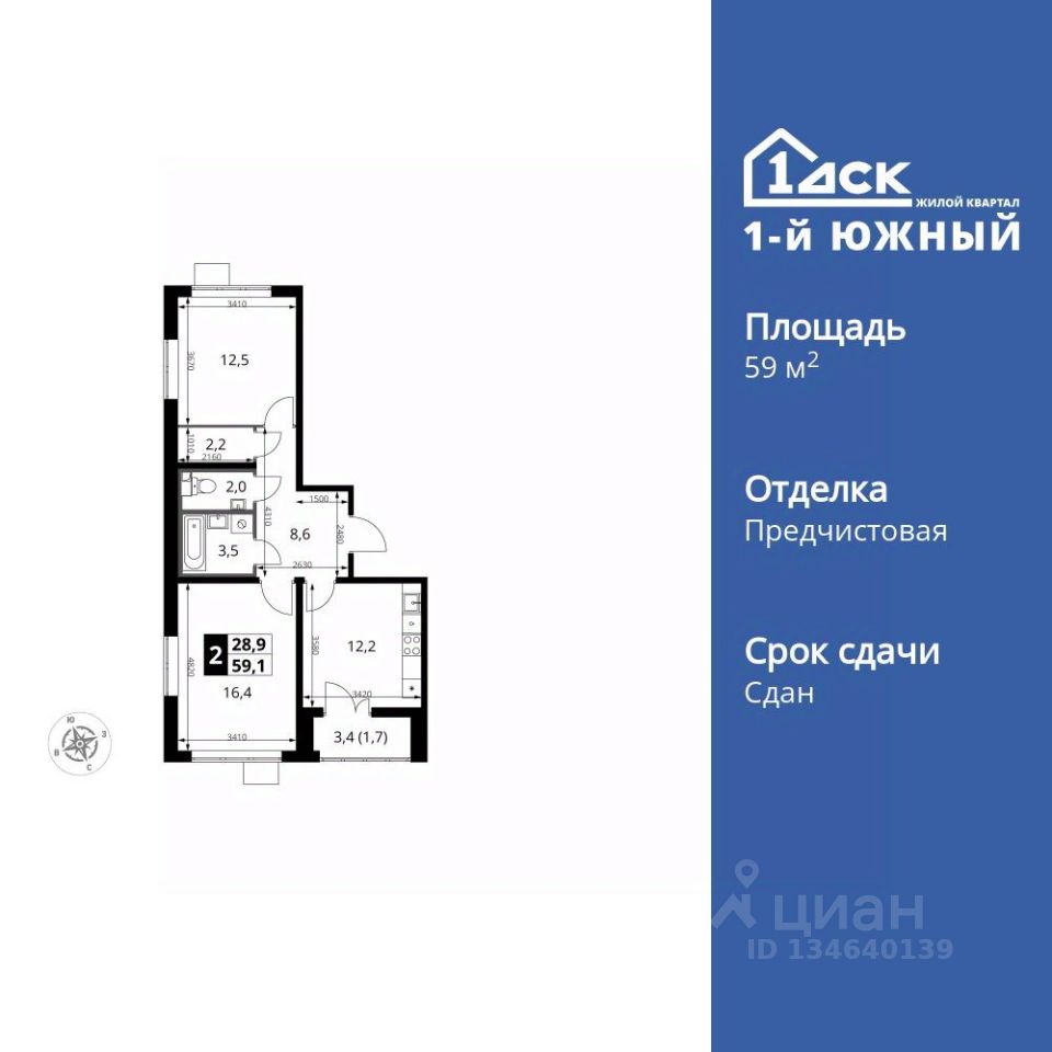Продаётся 2-к квартира номер 45 общей площадью 59.1 кв.м. на 13-м этаже 24 этажного здания. Отделка Whitebox. Цена с учётом скидки.