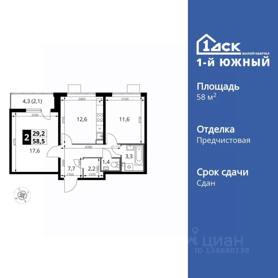 Продаётся 2-к квартира номер 138 общей площадью 58.4 кв.м. на 9-м этаже 24 этажного здания. Отделка Whitebox. Цена с учётом скидки.