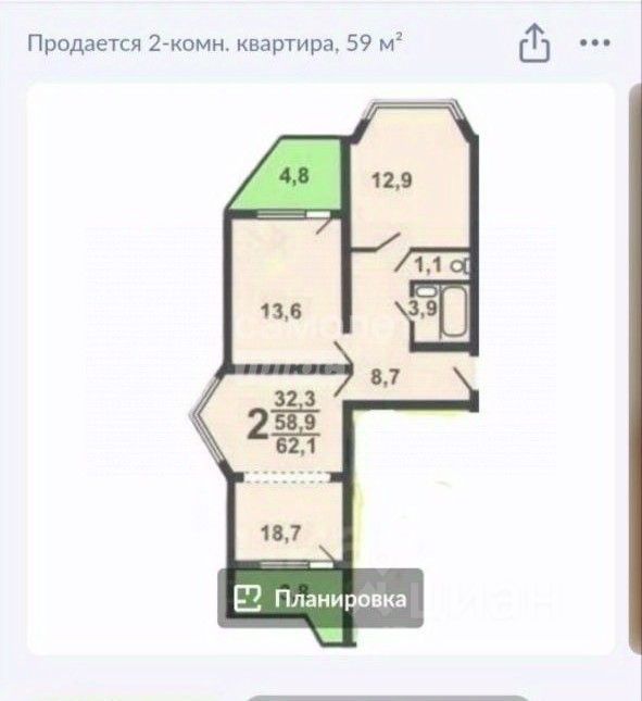 Общая площадь 59 кв м + две застеклённые лоджии 3.8 и 4.8 кв м. Большая кухня 12.9 кв м, отличная планировка распашонка, окна выходя на улицу и во двор. Квартира чистая ( только после косметического ремонта), просторная , пустая ( без мебели ). Расположена на комфортном среднем этаже.
