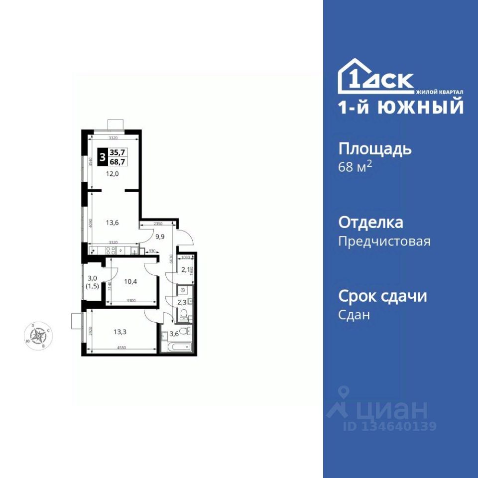 Продаётся 3-к квартира номер 171 общей площадью 68.4 кв.м. на 15-м этаже 24 этажного здания. Отделка Whitebox. Цена с учётом скидки.
