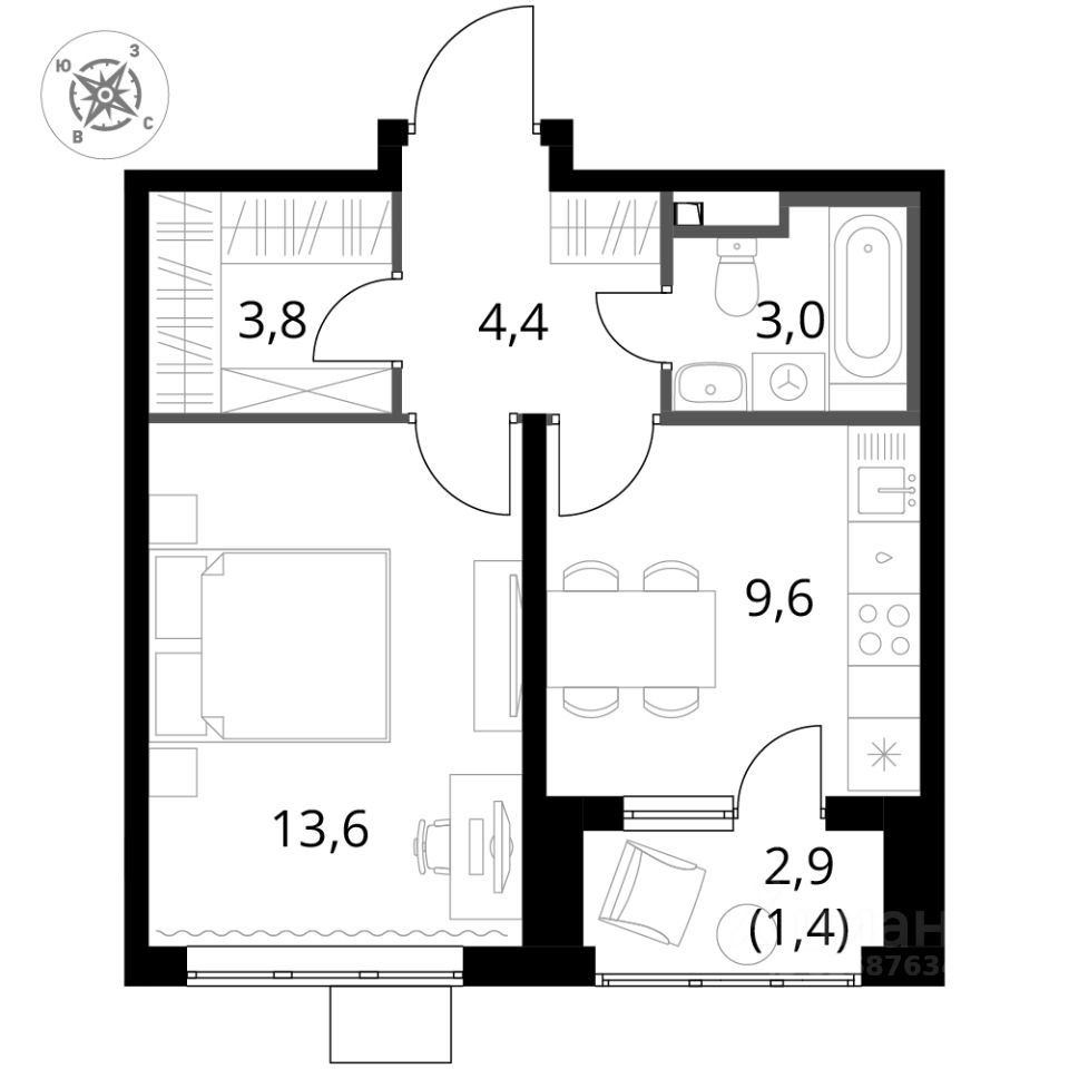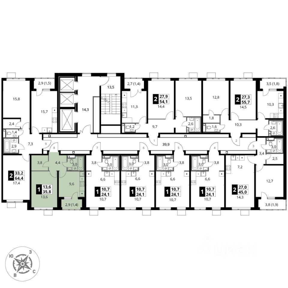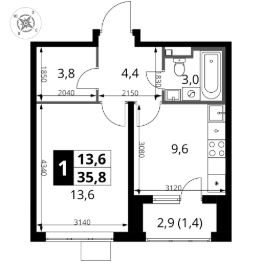 Продаётся 1-к квартира номер 581 общей площадью 35.8 кв.м. на 12-м этаже 24 этажного здания. Отделка Whitebox.
