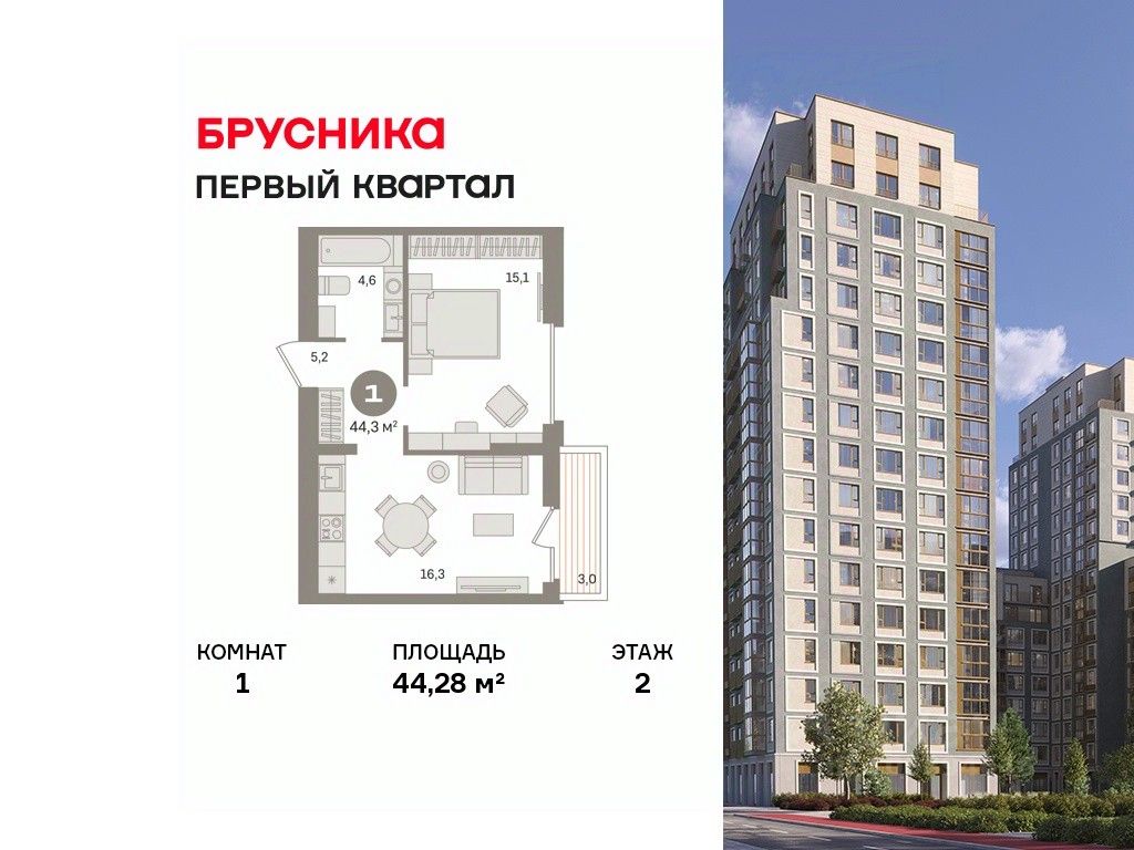 Квартира с кухней-гостиной и одной спальней в "Первом квартале". Особенности планировки: балкон, вид во двор, предчистовая отделка.
