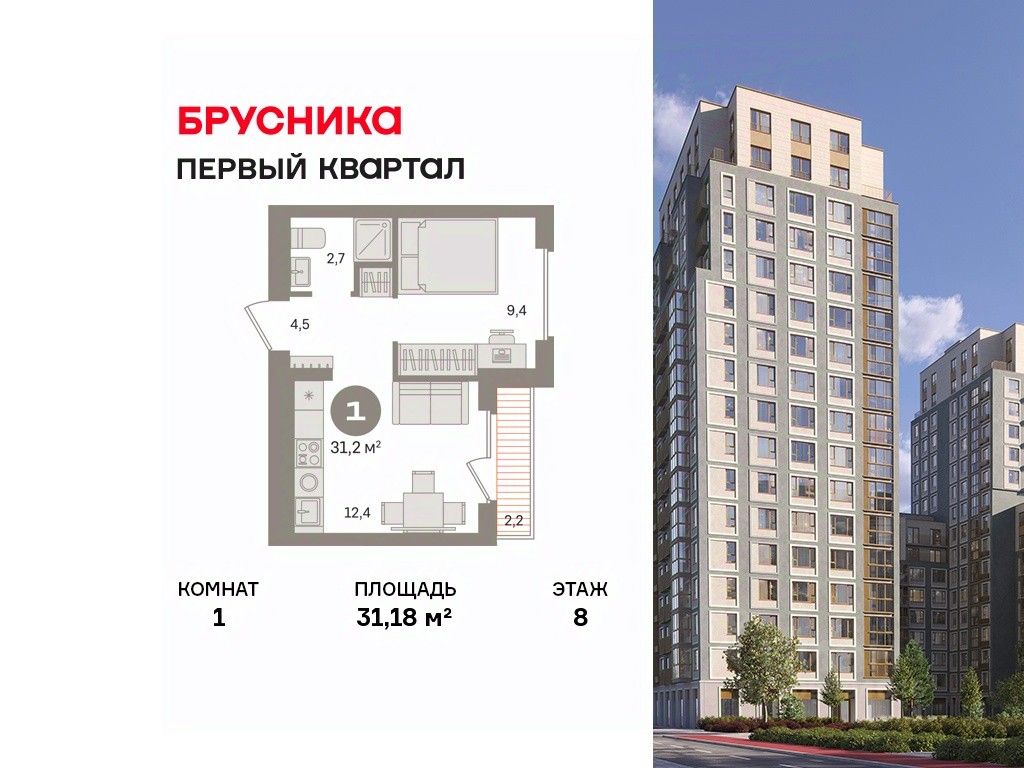 Квартира с кухней-гостиной и одной спальней в "Первом квартале". Особенности планировки: вид во двор, предчистовая отделка, терраса.