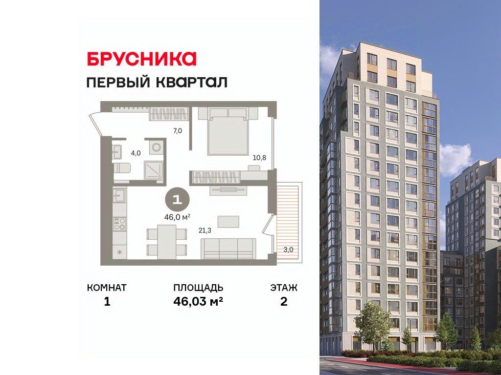 Квартира с кухней-гостиной и одной спальней в "Первом квартале". Особенности планировки: балкон, предчистовая отделка. квартиры в нашей базе: МТК06-Ж1.2.5.